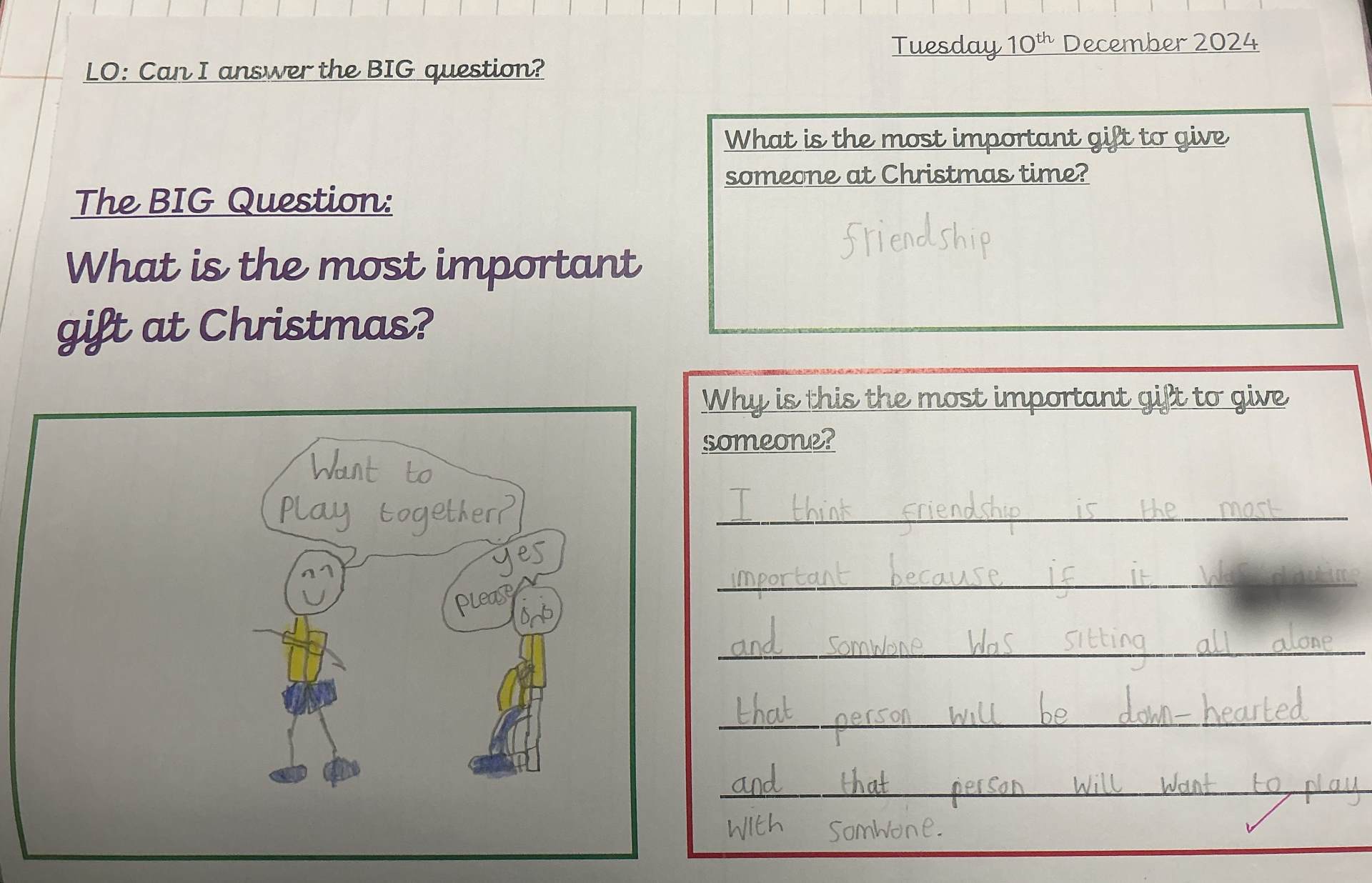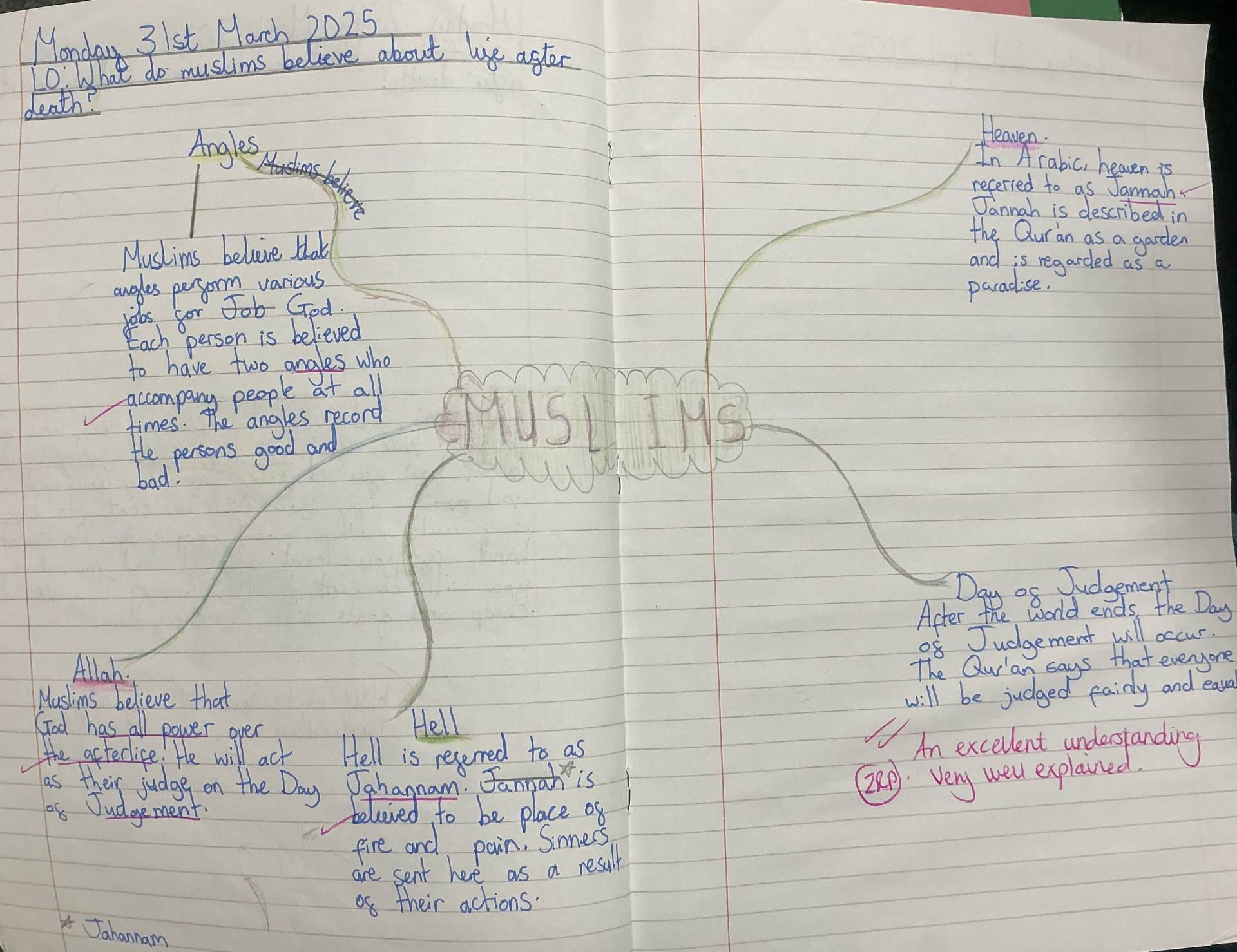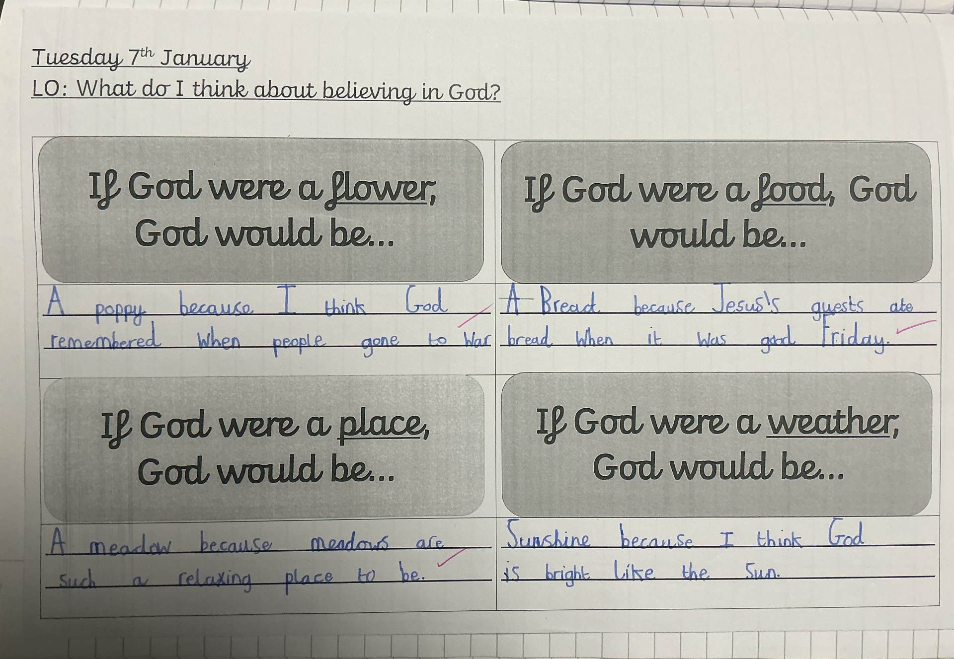 Each lesson (or key Question) from the programme of study has learning outcomes divided into Emerging, Expected or Exceeding. This allows teachers to track pupil progress through the lesson and through the unit. At the end of each unit, based on their knowledge of pupil responses during lessons and through work in RE books, teachers will assess each pupil as Emerging, Expected or Exceeding for that particular unit.