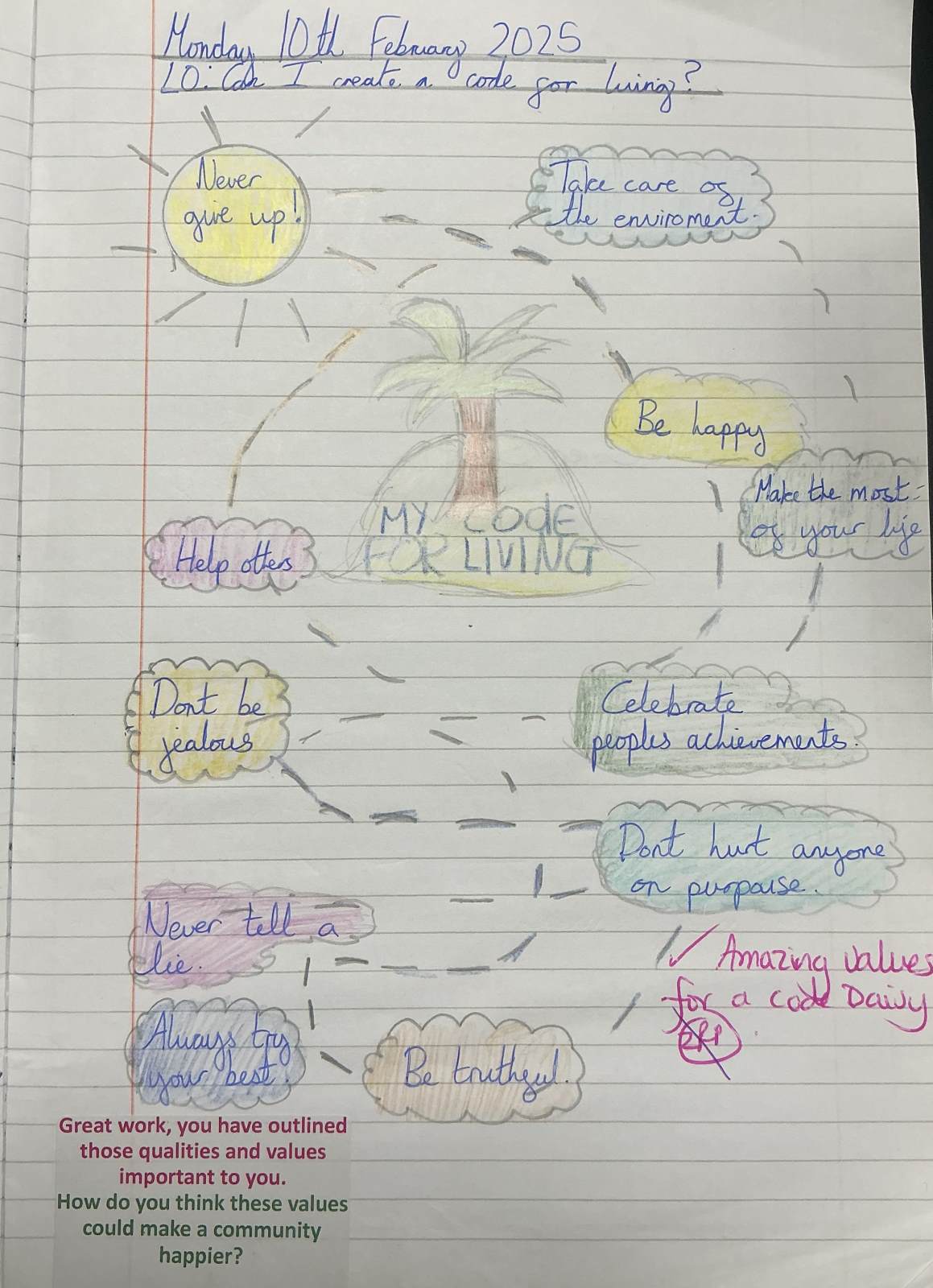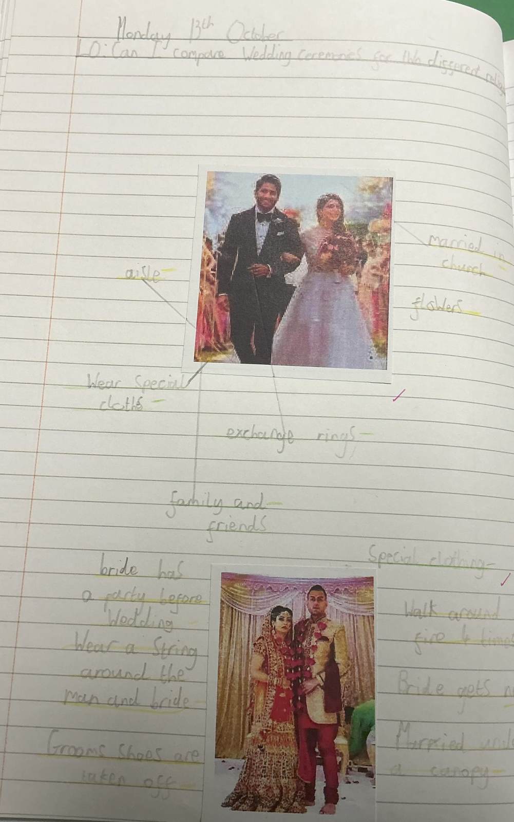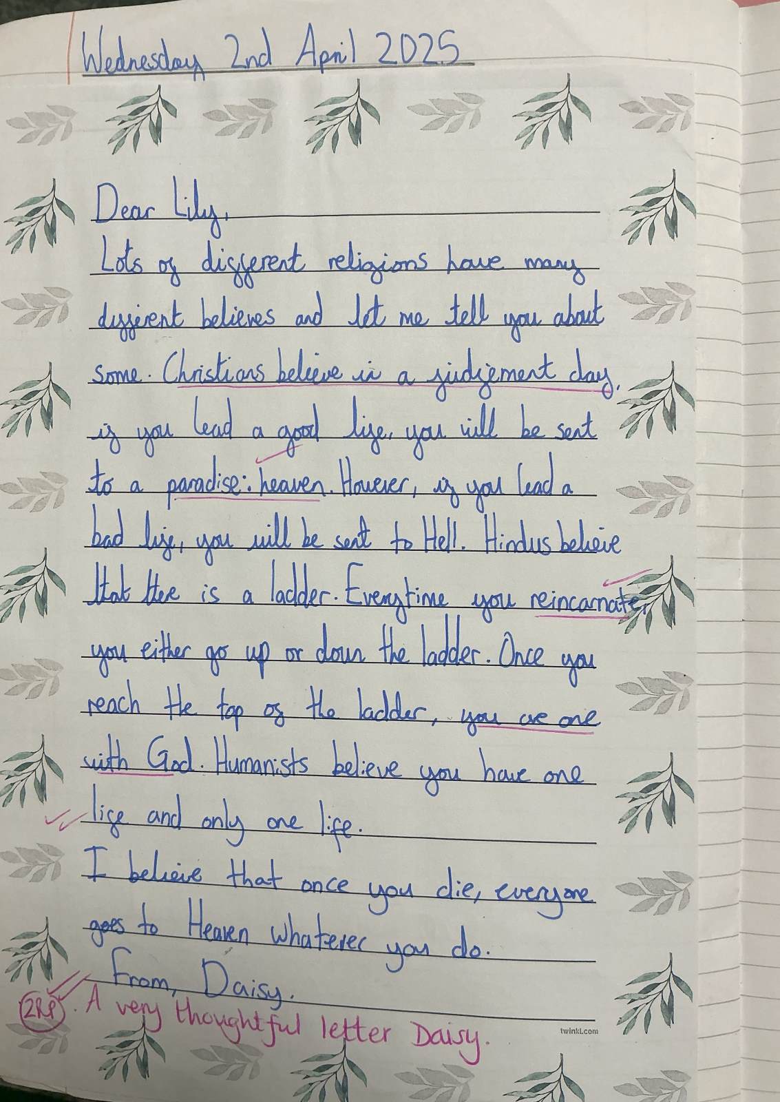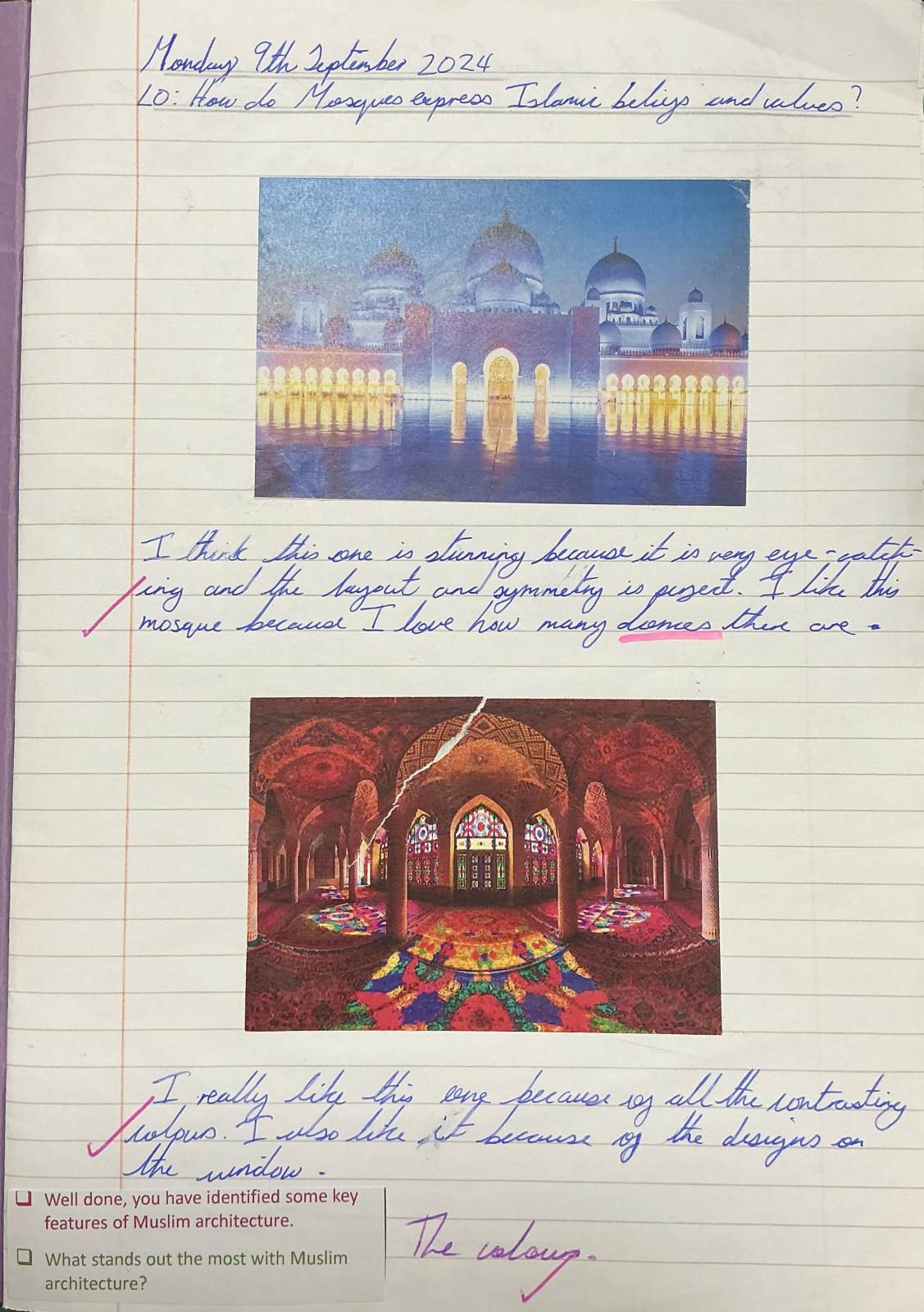 Each lesson (or key Question) from the programme of study has learning outcomes divided into Emerging, Expected or Exceeding. This allows teachers to track pupil progress through the lesson and through the unit. At the end of each unit, based on their knowledge of pupil responses during lessons and through work in RE books, teachers will assess each pupil as Emerging, Expected or Exceeding for that particular unit.