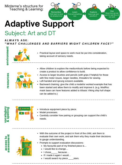 At Minterne, children are encouraged to experiment with their ideas, exploring colour, texture, form and a wide range of materials and processes. Regular opportunities for self‑evaluation and peer evaluation help pupils reflect on their learning, understand that mistakes are part of the design process, and recognise that perseverance and effort lead to success.