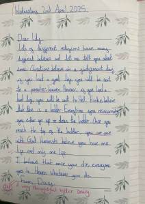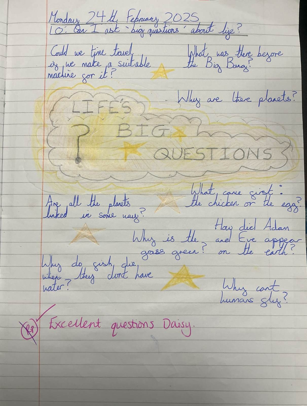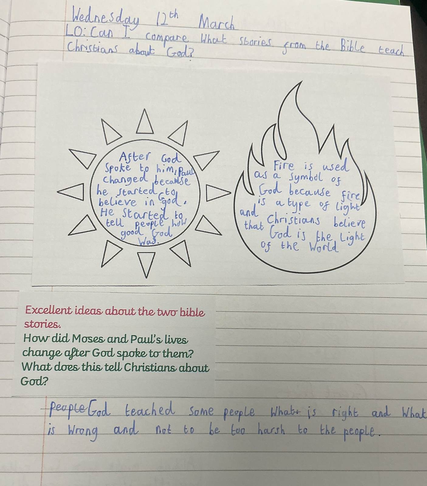 Each lesson (or key Question) from the programme of study has learning outcomes divided into Emerging, Expected or Exceeding. This allows teachers to track pupil progress through the lesson and through the unit. At the end of each unit, based on their knowledge of pupil responses during lessons and through work in RE books, teachers will assess each pupil as Emerging, Expected or Exceeding for that particular unit.