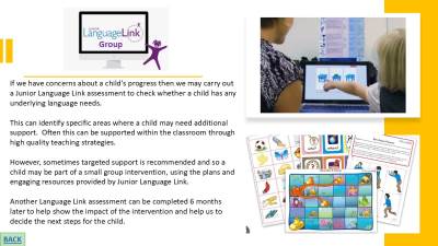 To help identify children who may need additional support we work alongside professionals (e.g. Community Paediatrician, Speech and Language Therapist, Occupational Therapist, Educational Psychologist, Local Authority) and also, track every child's progress three times per year. We hold pupil progress meetings at this point too, where specific individuals are discussed with our senior leadership team (SLT) and appropriate support is identified for a pupil.